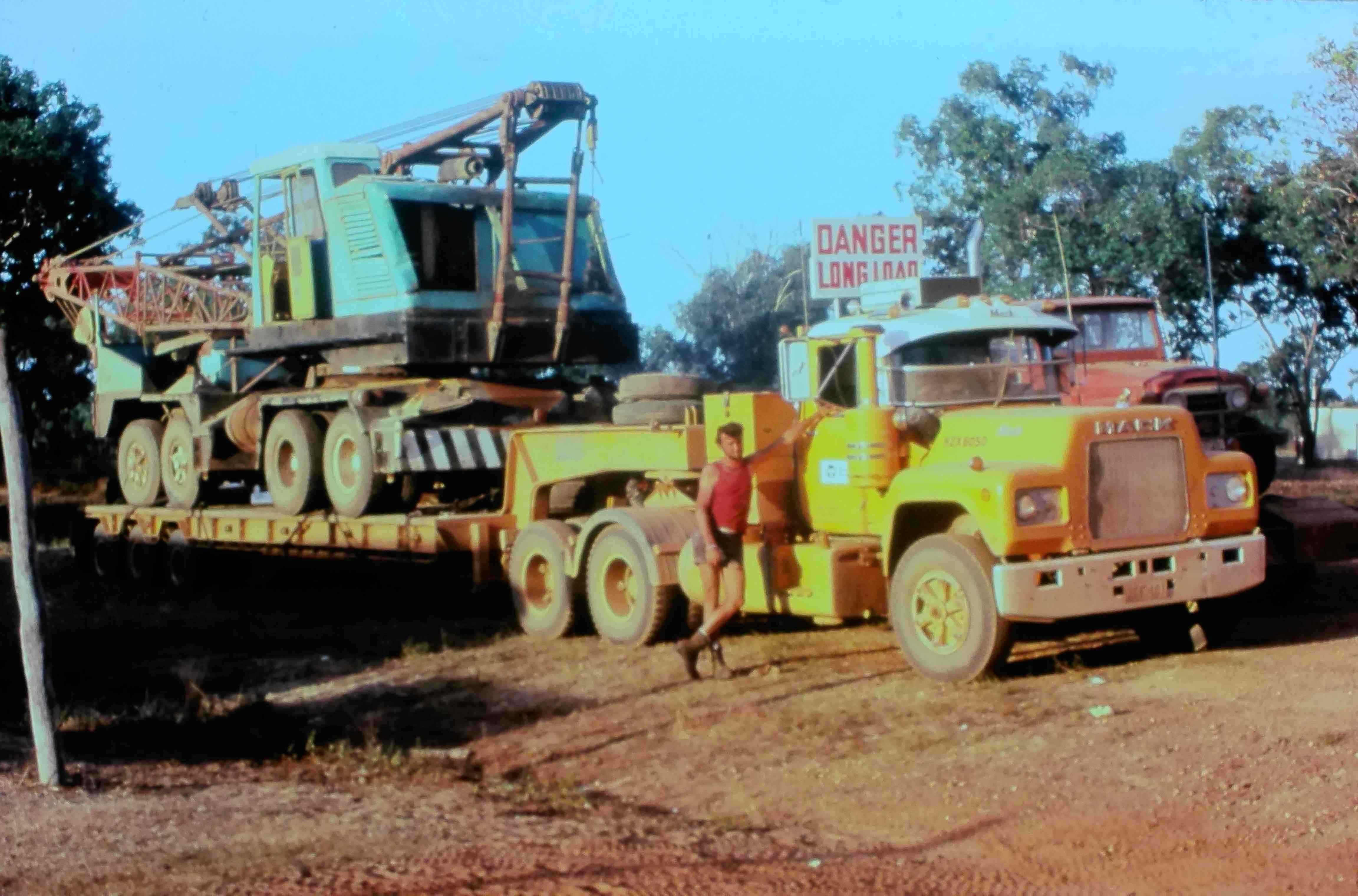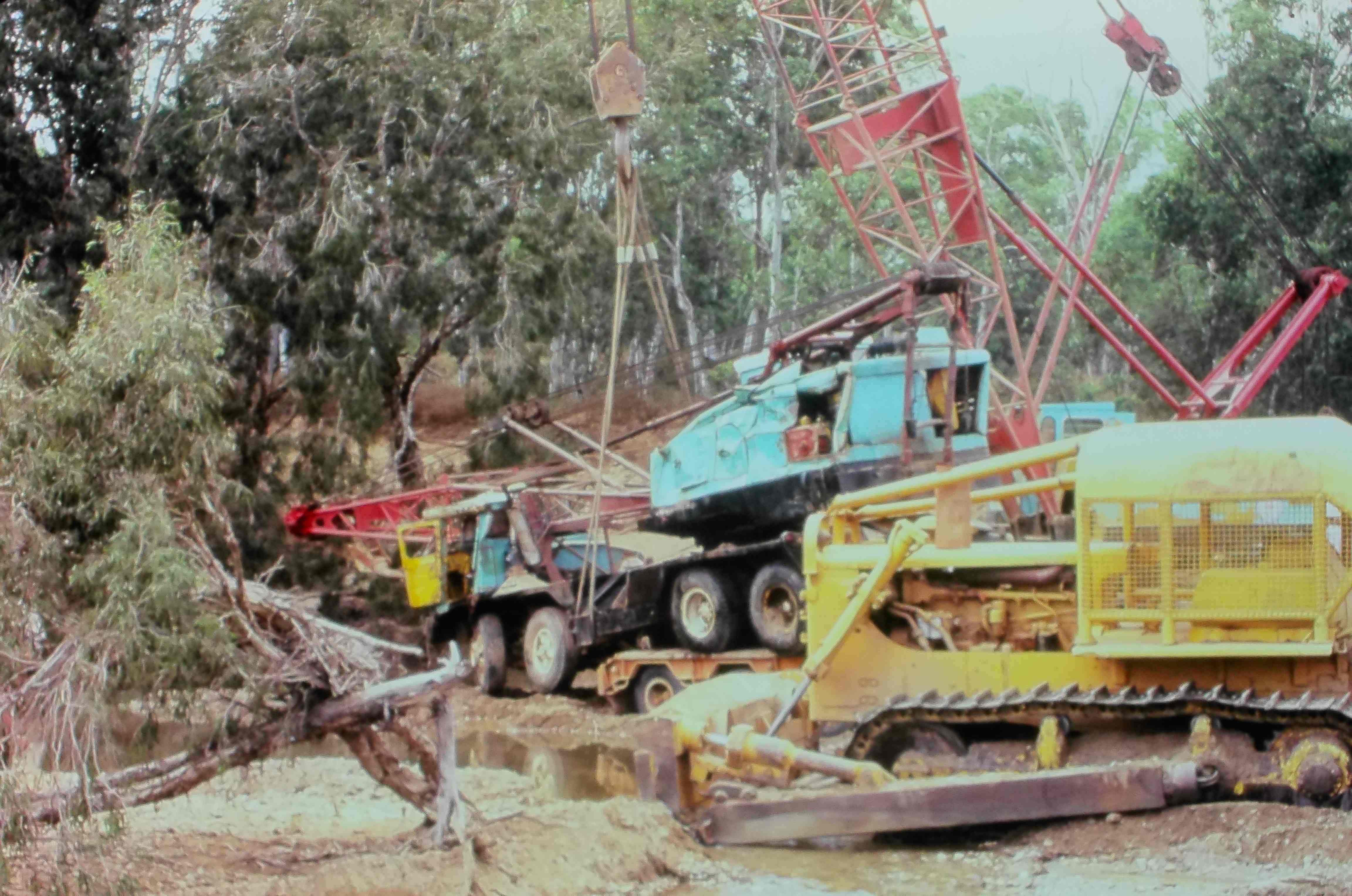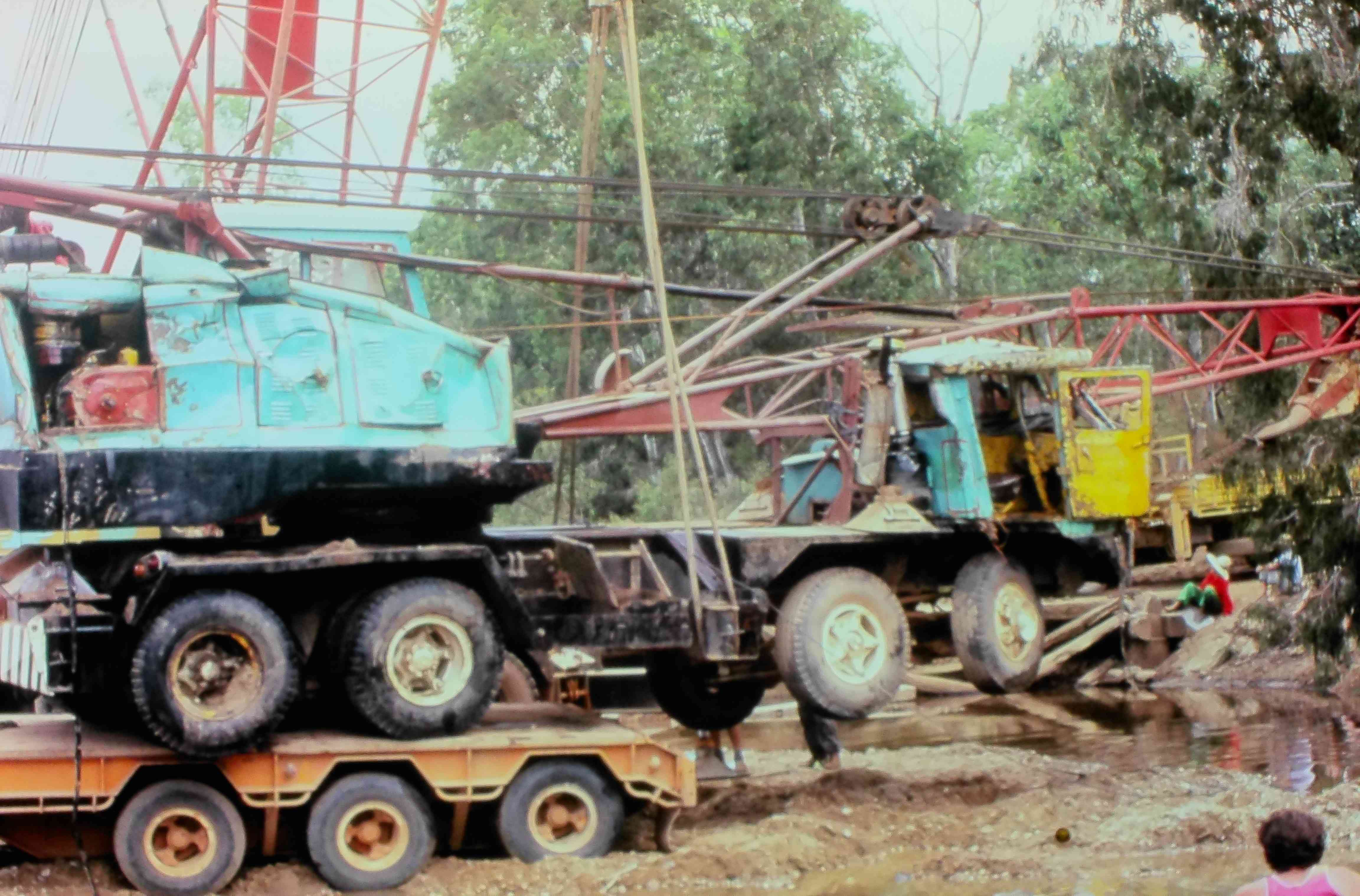 9428.7 Damaged truck on low loader crane/dragline in water