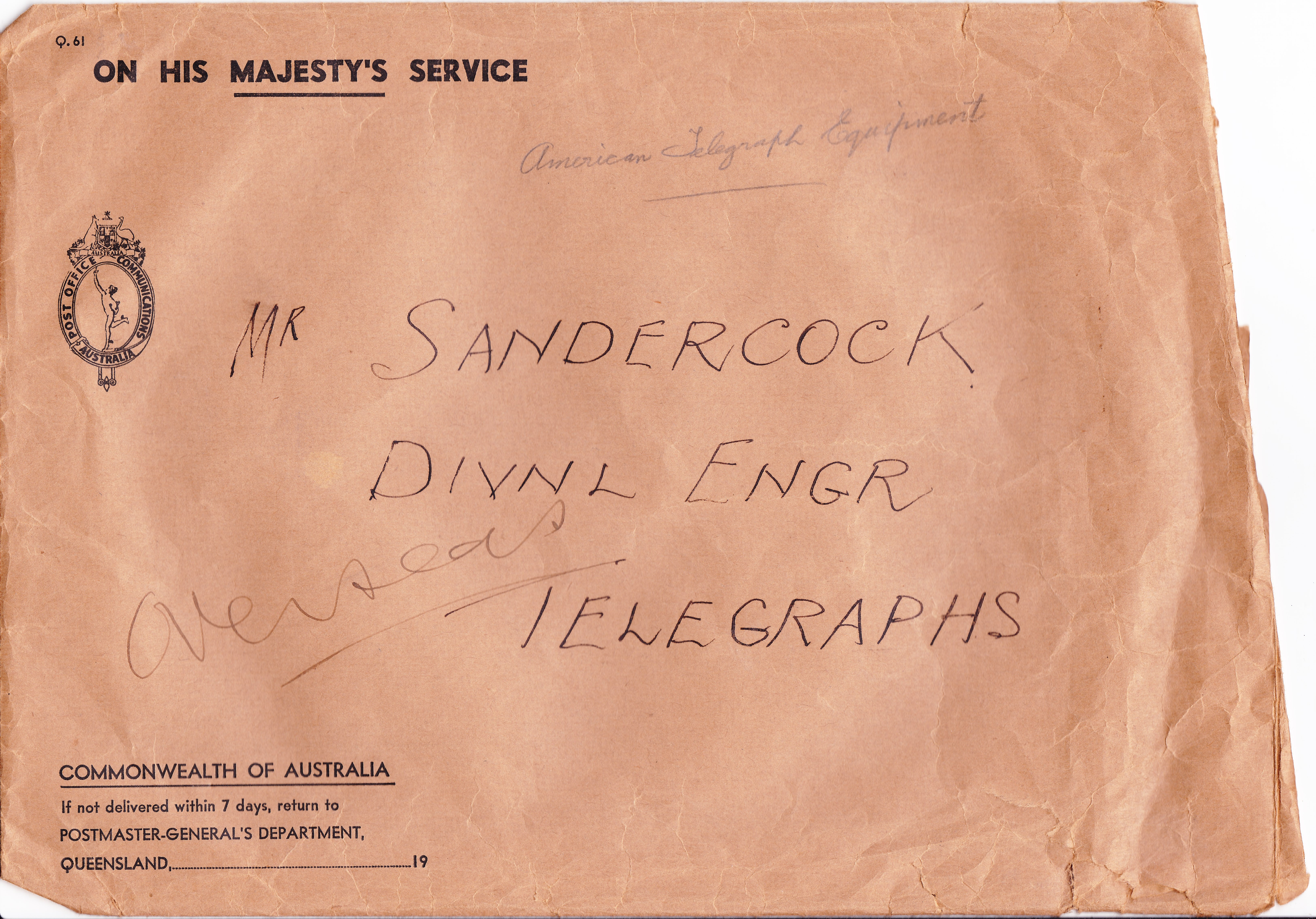 The envelope was addressed to “Mr SANDERCOCK, DIVNL ENGR, TELEGRAPHS”