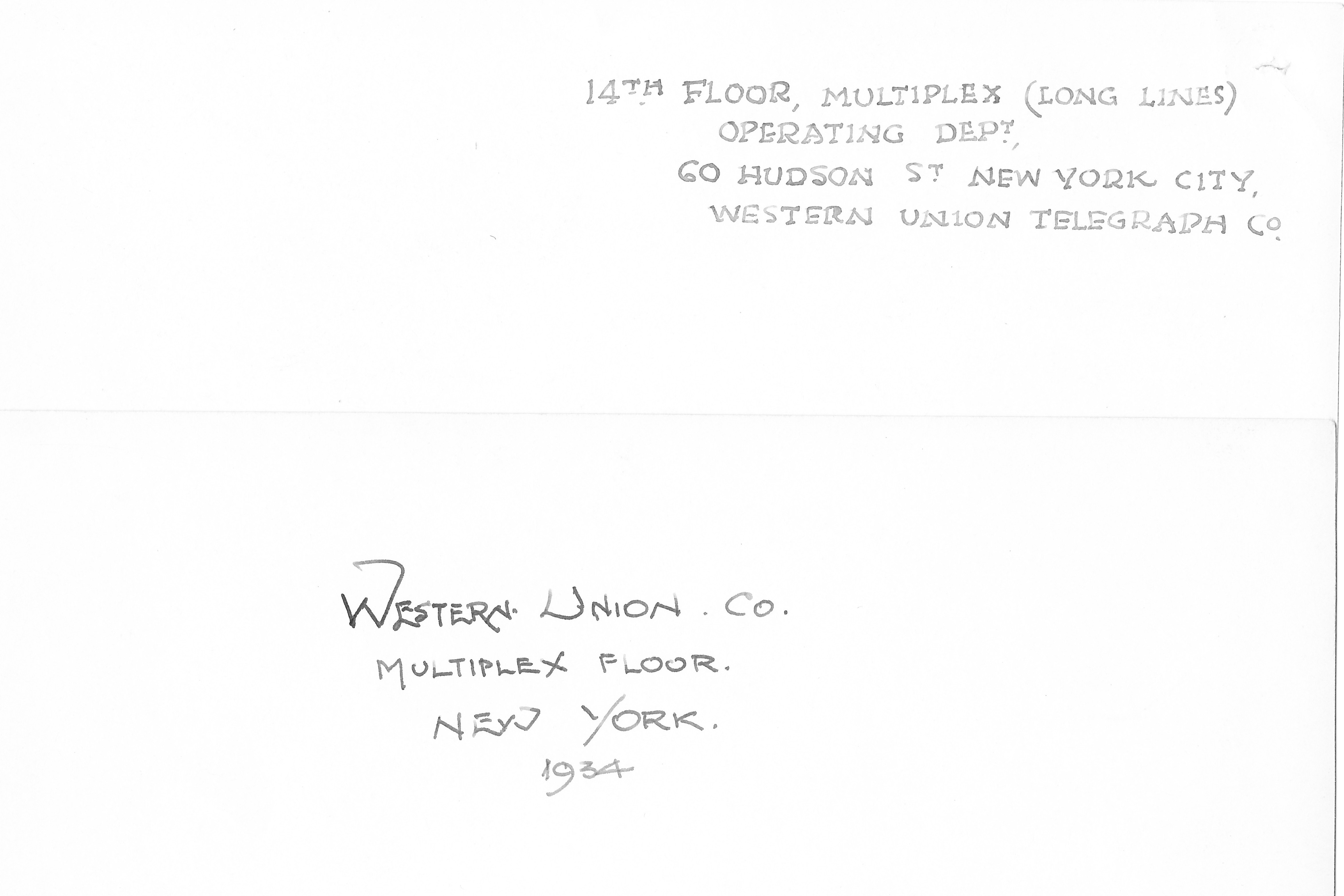 12 of the photographs are of the Western Union Telegraph Co, 60 Hudson St, New York City. Of these, 10 are showing the telegraph equipment dated 28 Feb 1929, and 2 are a duplicate copy of the 14th Floor, Multiplex (Long Lines) Operating Dept dated 1934.