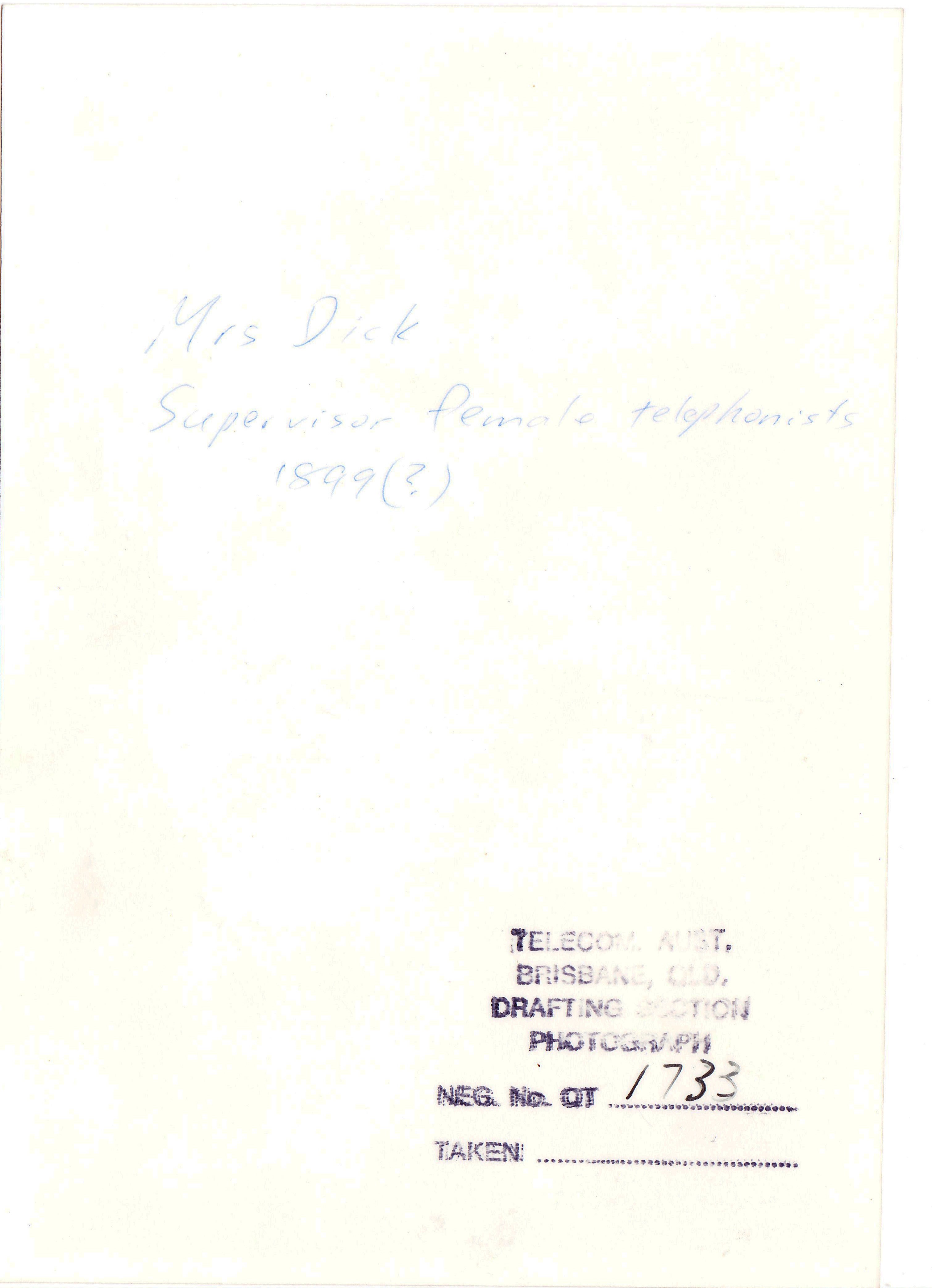 The 2nd Brisbane photograph is labled “Mrs Dick, Supervisor female telephonists 1899 (?)” and is stamped “Telecom Aust. Brisbane, QLD, Drafting Section Photograph Neg No. QT1733”.