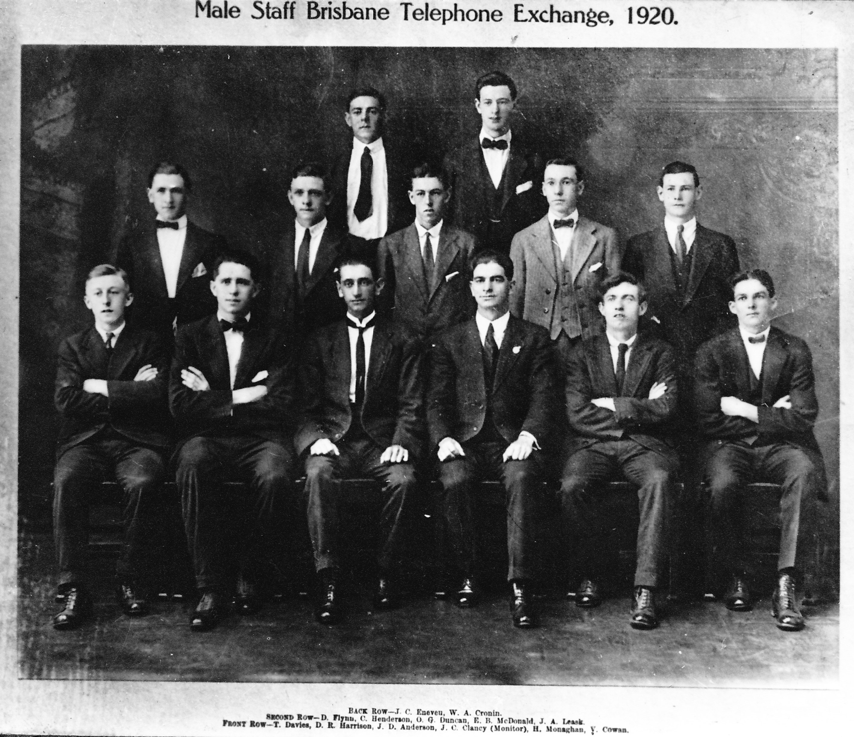 Also in the envelope were 2 photographs of Brisbane staff. One photo is labled “Male Staff Brisbane Telephone Exchange, 1920. Names are shown below the photo.