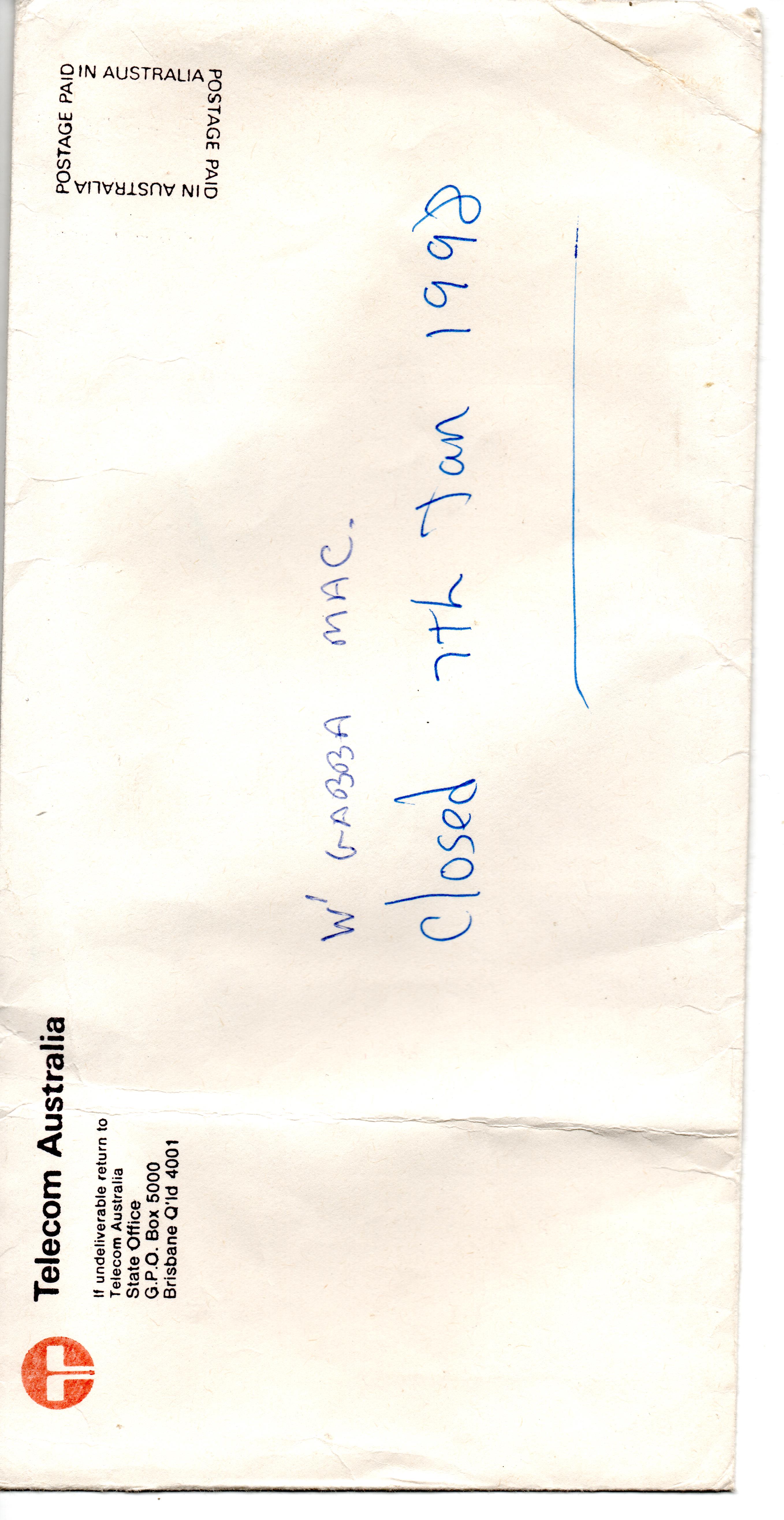 The envelope has no address, but hand written comments in blue pen on the front says “W’GABBA MAC. Closed 7th Jan 1998”.